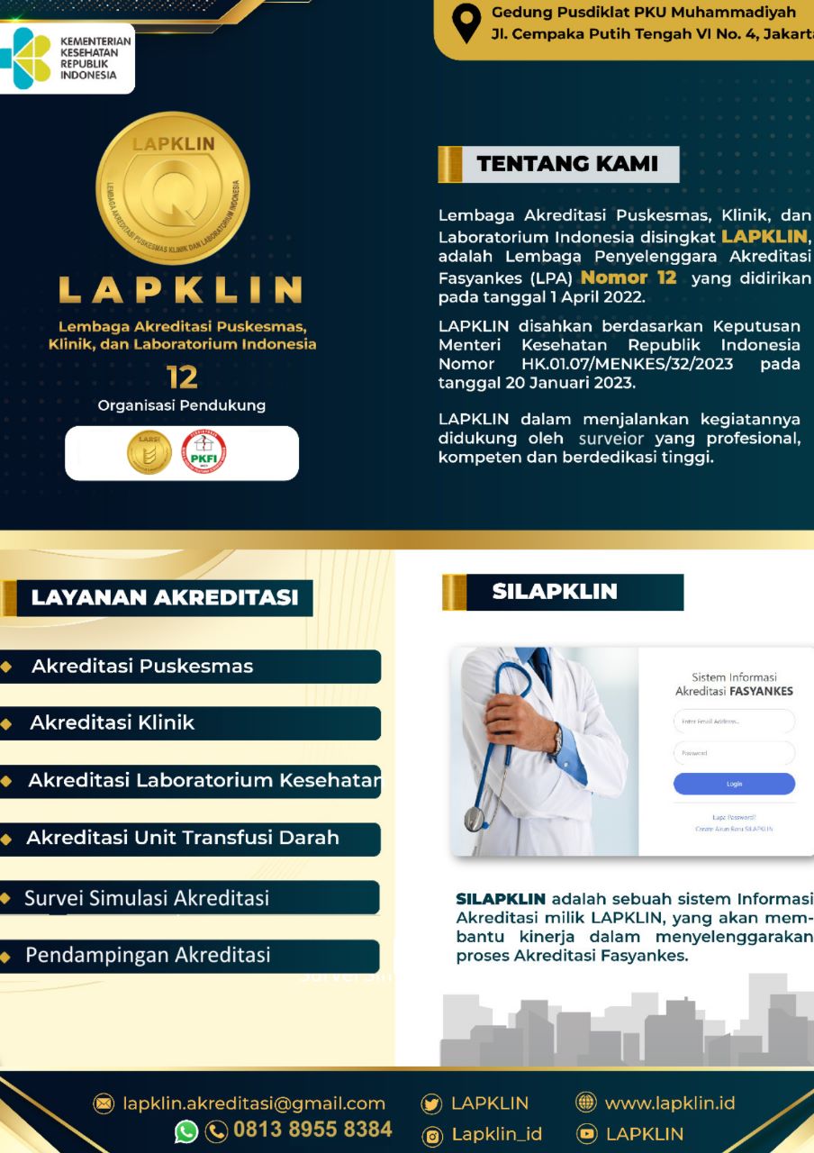 LAPKLIN - Lembaga Akreditasi Puskesmas Klinik dan Laboratorium Indonesia merupakan Lembaga Penyelenggara Akreditasi Fasilitas Layanan Kesehatan (Fasyankes) yang berhak menyelenggarakan Akreditasi Fasyankes di Indonesia No.12 yang didirikan pada tanggal 1 April 2022, LAPKLIN disahkan berdasarkan keputusan Menteri Kesehatan Republik Indonesia Nomor HK.01.07/MENKES/32/2023 pada tanggal 20 Januari 2023 LAPKLIN dalam menjalankan kegiatannya di dukung oleh surveior yang profesional, kompeten dan berdedikasi tinggi yang menerapkan nilai-nilai sebagai berikut :